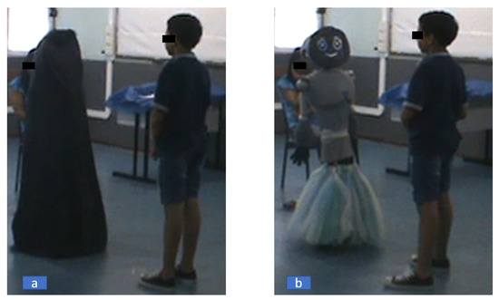 Experimental setup showing the child-robot interaction. (a) Before showing the robot; (b) After presenting it.