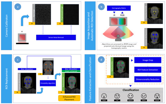 Figure 2 shows the proposed contact-free system for emotion recognition, which is composed of the following four steps: (a) camera calibration; (b) image acquisition and automatic ROI detection; (c) ROI replacement; (d) feature extraction followed by the dimensionality reduction and emotion classification.