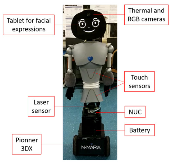 The experiment was conducted in three phases, as follows. First, N-MARIA was initially covered at the room with a black sheet, except its attached camera system, that was turned on to record visual and thermal images of the frontal view with sampling rate at 2 fps, for further processing. Afterwards, the child was invited to enter the room, and sit comfortably for explanations about the general activities related to the experiment, being conditioned to a relaxed state for a period of time minimum of 10 min, in order to adapt her/his body to the temperature of the room, allowing her/his skin temperature to stabilize for baseline recordings, according to similar studies carried out in Refs. [21,41]. Once they had completed the relaxation period, the child was placed in front of the covered robot about 70 cm away from it, remaining in standing position. Immediately, recordings of the child face by the camera system were carried out for a period of one minute with the robot covered, one minute with the robot uncovered, and three minutes of interaction with the robot. After, the child spent two minutes answering a questionnaire about the experiment.