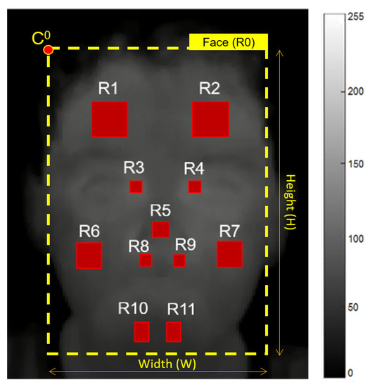 In our study, the facial ROI sizes were also computed using the width of the head, and the aforementioned proportions [17,18,21]. Additionally, the facial ROIs were spatially placed, taking as reference the expert annotation. Afterwards, the corresponding facial ROIs were projected on the thermal image through the aforementioned transformation using a homography matrix (see Section 3.2.2), such as shown in Figure 4. Here, the ROI set of a thermal frame b is defined by , being R the head ROI, and R for 1 to 11 the facial ROIs. Notice that R is described by several pixels for a range from 0 to 255 (gray scale of 8 bits).