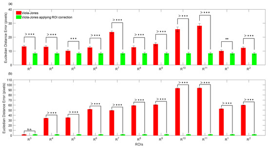 Comparison between Viola-Jones (without applying ROI relocations) and Viola-Jones applying ROI relocations, computing the mean and standard error per ROIs: (a) analysis from Baseline; (b) analysis from Test. n.s means no significant difference (), while * (), ** (), *** () and >*** () indicate significant difference. R, right forehead side; R, left forehead side; R, right periorbital side; R, left periorbital side; R, tip of nose; R, right cheek; R, left cheek; R, right perinasal side; R, left perinasal side; R, right chin side; R, left chin side.