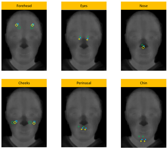 An automatic method was proposed here for face landmark detection over a given set of frames , taking as reference annotated ROIs by a trained expert on the frame , such as shown in Figure 4. It is possible to observe that these manual annotations were located on eleven ROIs () of thermal images, taking into account the relevance of these ROIs in other studies for facial emotion recognition [17,21]. Here, the facial ROI sizes were computed in the same way as in Refs. [17,18,21], using the width of the head ROI and the following defined proportions [18]: 6.49% for nose, 14.28% for forehead, 3.24% for periorbital region, 9.74% for cheek, 3.24% for perinasal region, and 5.19% for chin [17].