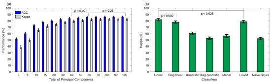 Performance of classification of five emotions applying principal component analysis (PCA) for dimensionality reduction. (a) Average accuracy and Kappa obtained by applying PCA for different principal components plus Linear Discriminant Analysis for classification; (b) average Kappa achieved for 60 principal components plus other classifiers.