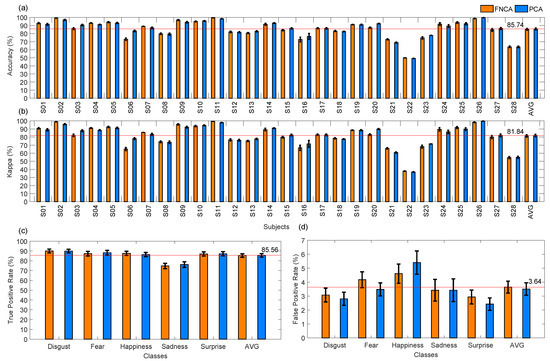 It is worth noting that PCA improved the performance for subject S06 (ACC of 83.27% and Kappa of 78.10% for PCA, and ACC of 73.11% and Kappa of 65.09% for FNCA), such as shown in Figure 8a,b. This improvement may be consequence of the PCA robustness for feature extraction under controlled head-pose and imaging conditions [9]. Also, notice that for subject S22 the lowest performance was achieved by applying PCA (ACC of 49.27% and Kappa of 36.75%) and FNCA (ACC of 49.98% and Kappa of 37.78%). However, ACC values higher than 85.74% were achieved for a total of 14 children by applying PCA or FNCA, being the highest ACC of 99.78% for subject S26 using PCA. Labelling feature vectors of emotion patterns is a challenge, mainly when labels are assigned over periods of time, as some delays between both perception and manual label assignment may exist. Similarly, a visual stimulus may produce different facial emotions, thus, the manual labeled procedure is subjective. Then, an automatic method for feature set labelling may be suitable to obtain reliable labels and therefore a classification model for LDA.