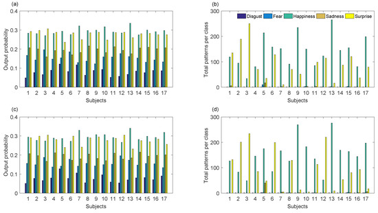 Many researchers [1] have conducted studies to infer facial emotions over visual images using only three out of the six basic expressions, specifically happiness, surprise and sadness, as these emotions are easier to be recognized for humans, and have been successfully used to generate cohesive expressions across participants. Similarly, other studies using visual images report that the recognition rates for expressions as fear or disgust can be very low, in a range from 40 to 50%. As a highlight, five basic emotions were recognized by our proposed system based on infrared camera, achieving the highest performance for both disgust (TPR of 89.93%) and fear (TPR of 88.22%), followed by happiness (TPR of 86.36%) and surprise (TPR of 87.14%), such as shown in Figure 8c and Table 4. In agree with other studies [17,21], our results show that thermal images are promising for facial emotion analysis and recognition.