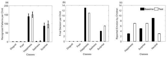Similarly, this database was used as a training set of our recognition system to infer emotions on 17 children, while they firstly remained in front of N-MARIA covered by a period of time, and after it was uncovered. Figure 9a–d and Figure 10a,b show inferred emotions by our system for the seventeen children during the Baseline and Test experiments, being happiness and surprise the most frequent outputs. Emotions such as disgust, fear, and sadness were few inferred by the system, which agree with what the children reported, such as shown in Figure 10c.