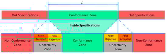 Uncertainty should be calculated to evaluate whether additional manufacturing tolerances can be achieved. When an MT is used as a measurement system with a probe to determine part dimensions, the MT measurement uncertainty determines the conformance zone. Figure 1, whose upper bar shows specifications and lower bar the influence of uncertainty, shows that false acceptance could occur if the uncertainty interval is outside the tolerance zone, but the measurement remains within the tolerance limits. However, false rejection could occur when the measured value is within the tolerance zone, but the uncertainty is higher. If uncertainty becomes minimized, the conformance zone is increased, thus reducing false acceptance and rejection. In 2006, Forbes illustrated conformance and non-conformance zones based on uncertainty values [].