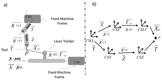 To link the geometric errors of the MT with the measured errors, it is necessary to solve the mathematical problem of equating both chains (Figure 2b); this may be achieved by providing the equation of motion of the MT (Equation (2)) where bar letters represent vectors or matrices that provide laser tracker coordinates from MT nominal positions taking into consideration the MT architecture.