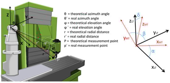 The kinematic chain is defined through structural components of the machine and symbolizes the flow of the movements of the machine. Slocum [] and Duffie et al. [] presented a procedure based on homogeneous transformation matrices between axes (assuming the rigid-body hypothesis) and geometric errors. Wenjie [] used these matrices as a systematic approach for the modelling of the geometric error of MTs; Rahman et al. [] measured intra-axis and inter-axis errors in the kinematic model of the MT using a touch trigger probe as the measurement system, and Khan et al. [] developed a systematic method to obtain the kinematic model of an MT with five axes of movement. Aguado et al. [,] introduced an LT measurement system on the MT model, as shown in Figure 2, where each axis is represented by a coordinate system, which is modelled by a rotational matrix and a translational vector.