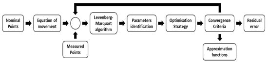 Approximation functions that characterize MT geometric errors may be obtained, thus minimizing the difference between the real and the nominal points. The difference becomes minimized using an iterative process of parameter identification through the MT equation of movements. Therefore, the objective function is the difference between pairs of points (Equation (27)).