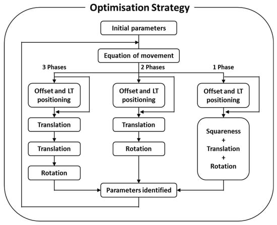 - Optimization strategy. To identify the geometric errors of the MT, a one phase optimization procedure is used as is shown in Figure 6. From information of a single LT, the influence of squareness, translation, and rotation error are considered together.