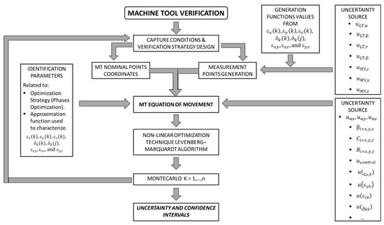 Although users often ignore the uncertainty of verification, the use of the MT as a traceable measurement system in the manufacturing process [] has increased the need for users to be aware of it. In this paper, the sources of uncertainty that affect MT volumetric verification are classified and analyzed into four groups: the MT, the measurement system itself, the measurement strategy, and the optimization strategy. All uncertainty sources have been modelled and introduced to the MT kinematic chain to obtain their joint influence using the Monte Carlo method to determine how different LT locations affect measured points. The same method has also been used to estimate the influence of measurement uncertainty on MT verification by analyzing its probability distribution function (PDF). In this manner, the accuracy of the machining parts and a positioning accuracy better than the LT uncertainty influence cannot be ensured.