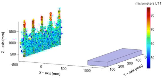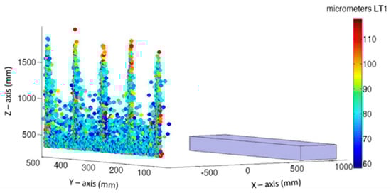 If both figures are compared, there is a central zone with Z values lower than 700 mm in Figure 9 and 1100 mm in Figure 10, where there is a higher concentration of lower maximum errors. In the same manner, there are five columns that rise in the Z-axis, with a higher concentration of upper values. In both cases, these columns are located in the same planes (Y and X) as that of the verification points.