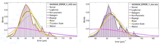 Figure 11 presents the values obtained from Equation (24); hence, no negative values exist, in addition to the LT position and the maximum error introduced for each one. Although measurement uncertainty from radial and angular encoders has been defined as a normal distribution, none of the presented PDFs describes the real distribution of maximum errors properly.