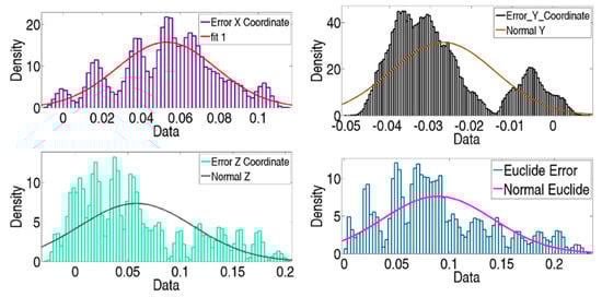 Figure 14 shows the final errors in the verification points of all simulated tests. If we compare it with Figure 12, it can be seen that the final error distribution presents a normal distribution, particularly the final error in the distance and the error in the Y coordinate.