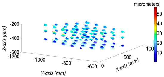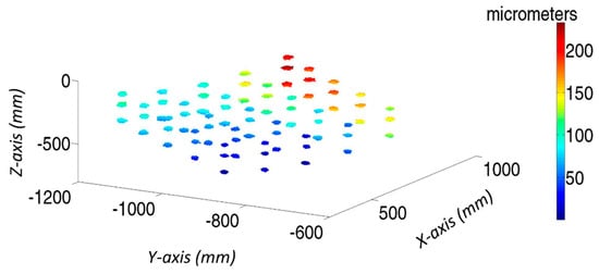 Figure 13 analyses the initial error distribution along the verification mesh (Equation (1)). For each verification point, there are 1000 samples affected by the same geometric error; however, with a different LT noise, there is a cloud of measured points around nominal positions. It can be observed that geometric errors have increased from the reference point, in this case the corner of the cube, following a systematic behavior. So, the main aim of volumetric verification is to compensate for this error influence on MT accuracy. Moreover, there are no strong variations in the color of each point cloud; hence, the influence of geometric errors is greater than the measurement noise.