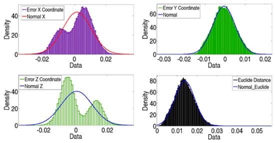 Figure 12 shows verification point errors in the X, Y, and Z axes in the LT coordinate system. These errors are the joint influence of its errors and LT noise. Although the probability distribution of LT components is normal, the joint influence of geometrical and measurement error cannot fit a normal distribution.