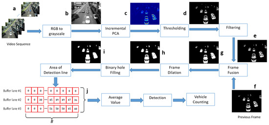 The block diagram of the proposed methodology consists of the input data, i.e., the Video sequence, the individual frames from the video sequence depicted in Figure 1a passes through the RGB to grayscale block in order to convert each frame from an RGB to a grayscale image Figure 1b Then, the grayscale frames are the input for the Incremental PCA block once the first eigenvector is used to project the actual grayscale image, the resulting image is shown in Figure 1c, this projected image uses the function heatmap to remark the variance in the pixels which represent motion, this projected image passes through the Thresholding block, in this block are thresholds based on statistic parameters (mean and standard deviation), it will set the pixels to “one” if these pixels belong to the foreground or movement; and set to “zero” if the pixels belong to the background—the results of the Thresholding block is the image in Figure 1d, but this image contain small groups of pixels which do not represent significant movement, and could be considered noise in the motion detection. To solve this issue, the Filtering block is implemented to eliminate those groups of pixels below a minimum size, relative to the size of the frame, the results are presented in Figure 1e. Moreover, this continuous process uses two main frames from the video sequence, the actual frame and the previous frame. Another important issue in motion detection is the foreground aperture problem, splitting large objects due to the similarity of the object’s internal pixels, so to overcome the object separation as a consequence of the miss detected motion in the internal pixel of the object, Frame fusion block was implemented, and OR operator wass applied in actual and previous frames (Figure 1f), the overlap images form a single object, avoiding the typical split in large motion objects, the result is shown in Figure 1g. Now some lines in the object are very thin, in order to maintain those lines, the Frame Dilation block is implemented, the results are shown in Figure 1h. In order to avoid double counting of the same object, the internal holes of the movement object must be filled, this task is done in a Binary hole filling block, and the results are depicted in Figure 1i. Finally, a detection line must be set up in each lane on the road. For each lane, an initial terminal point is stabilized, the objects considered as movement pass through the detection line in the corresponding lane, then a buffer is initiated to store the number of foreground pixels detected. When the object is no more in the detection line, the buffer used to detect considers the absence of the object as a falling edge, and the Average value block performs a computation of the foreground pixels detected—considering the area of detection line and also the number of frames when the object was detected, then a Detection block based on threshold allows the detection and a classification of the object based in the inferred size by the values in detection line.