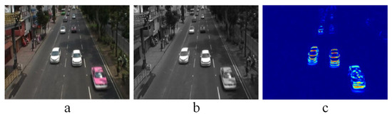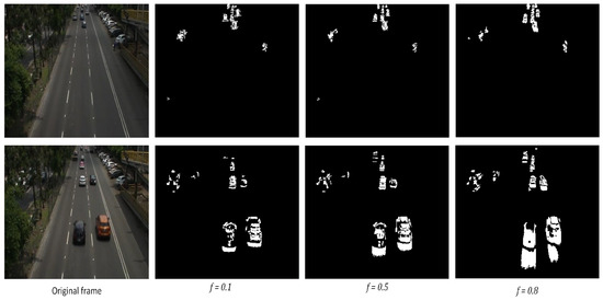According to our previous experiments in parallel works, a higher f works better for objects moving slower (e.g., pedestrians, animals, slow vehicles in streets), since the objects in motion are retained in the scene for longer intervals of time. In this application, has been established in order to retain just the minimum amount of movement of the vehicles that move at high speed, preventing the “ghosting” effect. Figure 4 shows the effect of the forgetting factor f for different values. It can be noticed that the higher the value of f, the better small moving objects in the scene are preserved. However, big moving objects leave a “ghost” behind them, which is not suitable for our application.