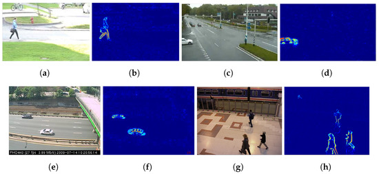 Motion detection using Incremental PCA over different scenarios from Changedetection project: (a) original RGB pedestrian frame; (b) heatmap projected of (a); (c) original RGB twoPositionPTZCam frame; (d) heatmap projected of (c); (e) original RGB streetlight frame; (f) heatmap projected of (e); (g) original RGB PETS2006 frame; (h) heatmap projected of (g).