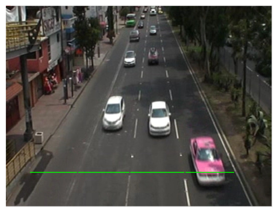 One of the main approaches for vehicle counting is based on extracting information using ROIs (Regions of Interests). In this work, we propose the use of a lineal ROI over each individual lane of the avenue to count vehicles. The virtual detection line is highlighted in green and shown in Figure 8.