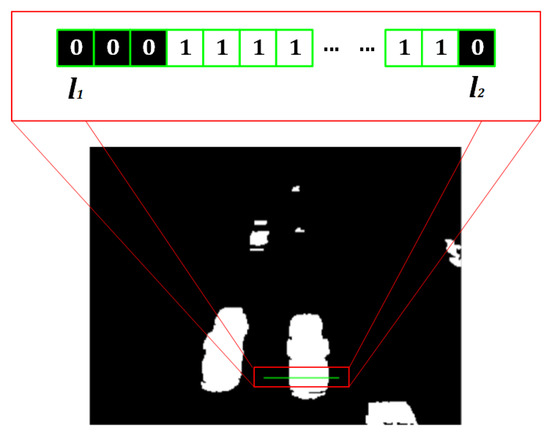 Figure 9 shows the logical representation of the detection line. Pixels with value 1 are the region of the vehicle that passes through the line in the present frame; and pixels with value 0 correspond to the background.