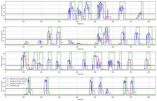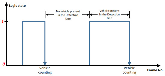 where, is a logic variable that indicates if a vehicle exists or not in the detection line, is the image containing the vehicles in motion, and are the initial and final columns of the detection line for a fixed row x of , B is the number of consecutive frames used to compute the mean value of the area occupied by the vehicles, and is the threshold value used to discriminate between noise and actual vehicles [15].