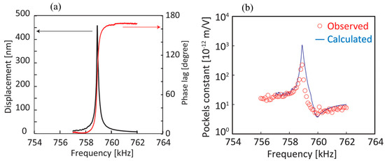 In Reference [13], the piezoelectric displacement and its phase-lag to the E-field were measured, as illustrated in Figure 1a. Figure 1b shows the EO coefficient calculated by Equation (3) and the experimentally observed data, which presents the consistency between the simulation and measurement [13].