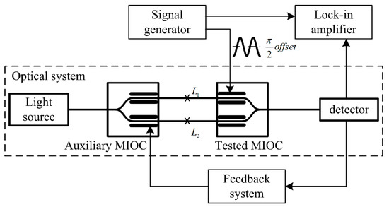 For accurate measurement of the MIOC halfwave voltage [16] at different frequencies, it is necessary to adopt a single frequency modulation wave. Based on the sinusoidal modulation scheme, the measurement method is shown in Figure 2, where the feedback system is used to suppress the slow phase shift introduced by the influence of environment and stress. The feedback system tests the average phase of the interference intensity. Additionally, when the average phase isn’t π/2, the feedback system will adjust the voltage on the auxiliary MIOC to make the average phase back to π/2.