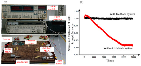 In this method, fluctuations of the external environment will cause instability of the lock-in amplifier output. Thereby, for optimization, a voltage feedback system is applied for suppressing the fluctuations. In addition, the lengths of fibers, L1 and L2, in Figure 2, need to be approximately the same. Moreover, the splitting ratios of the MIOCs are approximately 50:50. When considering the deviation of the splitting ratio, Equation (14) can be written as