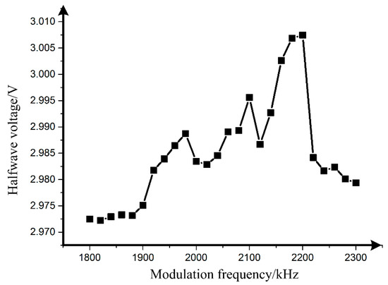 In the measurement, the amplitude of the modulation sinusoidal wave is fixed at 1 V, and the scanning frequency range is 1.8 MHz to 2.3 MHz. As can be seen from Figure 4, the halfwave voltage of the MIOC is about 3.007 V when the modulation frequency ranges from 2.18 MHz to 2.2 MHz, while it is about 2.973 V at 1.9 MHz and below. Further calculation indicates that the halfwave voltage deviation ratio at 2.18 MHz is 1.14%. The measurement result verifies the existence of the frequency-dependent halfwave voltage.