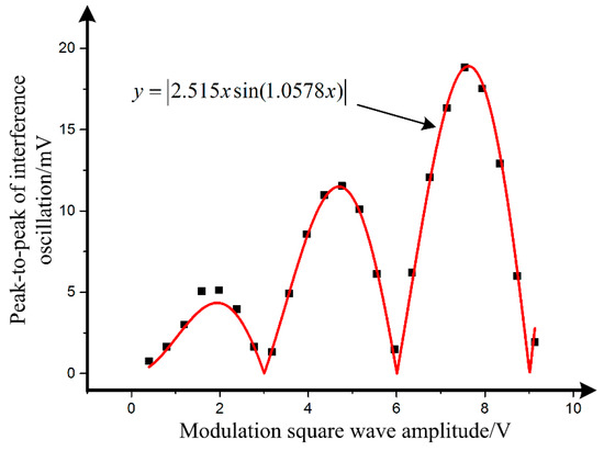 By selecting the second half of the stable segment of the curve as the evaluation area, a 5 mV peak-to-peak value of interference oscillation is calculated. Subsequently, by changing the amplitude of the modulation square wave, the measured relationship between the peak-to-peak value of interference oscillation and modulation amplitude is shown in Figure 7. The black points are the measurement results when the modulation amplitude changes, and the red line in Figure 7 is the model fitting using Equation (12).