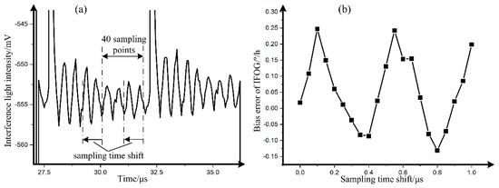 The performance of the IFOG is directly limited by the interference light intensity signal [1]. In Reference [14], the effect of interference oscillation on the performance of IFOG was presented. Herein, based on the IFOG system in Section 3, the 40 sampling points average is adopted, as shown in Figure 8a. When the sampling time is shifted, the bias error, also called an angular velocity error of the IFOG, is shown in Figure 8b, which was tested in the Earth’s rotation rate (7.56 °/h at laboratory location). The angular random walk and bias drift, calculated by the Allan deviation [1], were unchanged with the sampling time shift.
