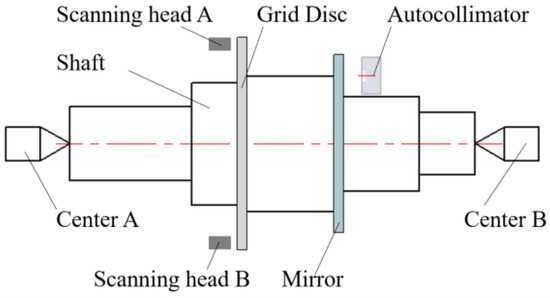 During the assembly of the whole rotary stage, the grid disc has to be assembled to the shaft before assembling the shaft into the rotary stage. The eccentricity error of the grid disc to the shaft can be measured in the initial stage, as shown in Figure 3. The shaft with the grid disc is supported by two centers and driven to rotate. Two scanning heads are fixed symmetrically to measure corresponding rotational angles. Because no radial error motion of the shaft exists at this stage, Equation (3) simply results in the assembly eccentricity error of the grid disc . Hence, after the whole stage is assembled and tested again, can be calculated by Equation (3) again so that can be separated by Equation (4). The same process can be applied to the x component in Equation (5). As a result, all , , and are measurable from this proposed method.