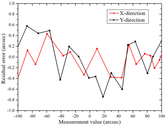Figure 5 shows the calibrated results of the miniature autocollimator by a commercial photoelectric autocollimator (AUTOMAT1000UH-3050, the accuracy is ±0.2 arcsec). Residual errors are ±0.5 arcsec and ±0.8 arcsec in the directions of X and Y, respectively, within the measurement range of ±100 arc-second with a resolution of ±0.1 arcsec.