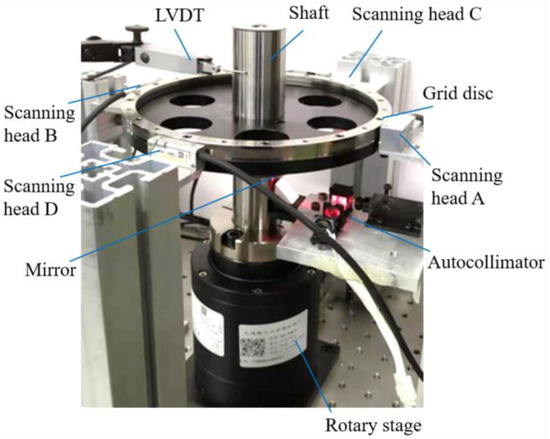 The experimental setup is shown in Figure 6. An encoder (Renishaw RESM20-USA200, the disc’s radius is 200 mm, and the resolution is 0.412 arcsec) with four scanning heads was used to measure rotational angle and radial error motions of the shaft. A LVDT was used to verify the predicted radial motion at a certain height. According to Equation (3) and the resolution of the encoder, the resolution of the measured radial error is 0.10 μm. The small autocollimator was fixed under the grid disc to measure the tilt error motion of the axis of rotation. Measurement data of the autocollimator and the encoder are acquired in real time by a multifunction I/O device (NI USB6002, sample rate is 50 kS/s) and two motion control devices (Lechuang MPC08) respectively. According to the sample rate, sample interval is 25.9 arcsec when the rotation speed of the stage is 1r per second in the experiment. If smaller latency is required, the data acquisition device with higher sample rate should be used.