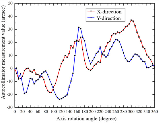 The total tilt errors in X and Y directions were measured by the autocollimator according to Figure 1, and mirror tilt errors were measured according to Figure 3. Figure 11 shows the measured mirror tilt errors and the separated actual shaft tilt errors calculated by Equation (6).