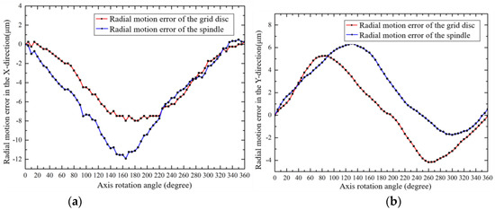 The radial error motions of the grid disc and the shaft: (a) X-direction; (b) Y-direction