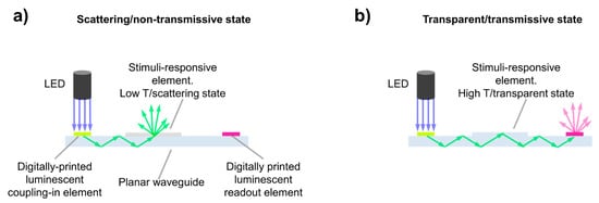 Figure 1. Optical planar waveguide sensor with integrated digitally-printed luminescent light coupling-in and readout elements. Remote excitation of the first luminescent element, by using an LED for example, enables coupling of light into the waveguide. Light is guided towards the thermoresponsive LCP element that regulates the light intensity transmitted towards the end of the waveguide where the second luminescent element is placed. (a) Scattering/non-transmissive state, at low temperature: light is scattered out of the waveguide at the stimuli-responsive element. (b) Transparent/transmissive state, at high temperature: light is not scattered at the stimuli-responsive element, and therefore, light further propagates in the waveguide and reaches the second luminescent layer. Remote luminescence intensity measurements allow quantifying the temperature in the sensor range.