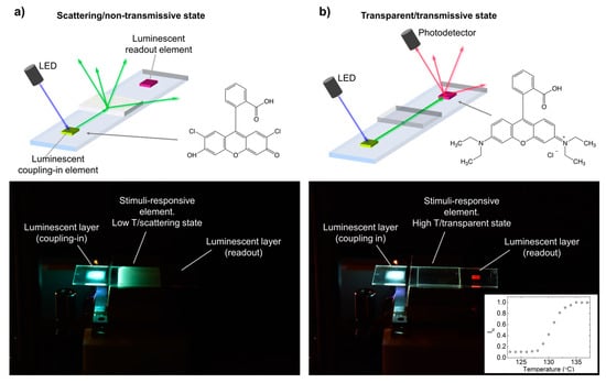 Figure 4. (a,b) Schematic representation (top) and photograph (bottom) of the optical planar waveguide sensor including a luminescent coupling element and a luminescent temperature readout element (a) in the scattering/non-transmissive state, at low temperature, and (b) in the transmissive state, at high temperature. Light from a UV LED (peak wavelength at 365 nm) excites from the top the photocured HRI-F27-02 layer that emits light, partly coupled in the planar waveguide and travelling towards the thermoresponsive liquid crystal polymer sensor material. Waveguided light reaching the HRI-RhodB-02 layer is partly absorbed and re-emitted as orange-red light. A photodetector measures the red light (633 nm) intensity emitted by this luminescent layer as a function of the LCP layer temperature. The molecular structures of F27 and RhodB are shown in (a) and (b), respectively. The inset in (b) shows a plot of the emitted red light (633 nm) measured as a function of temperature at the sensing region.