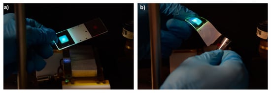 Figure 5. (a) Optical planar waveguide sensor including a luminescent coupling element and a luminescent temperature readout element fabricated on (a) a rigid cyclic olefin polymer (COP) substrate and (b) a flexible COP thin sheet. The sensor, at RT, is in the low T/high scattering state, and the luminescent coupling element is excited with a UV LED placed on top.