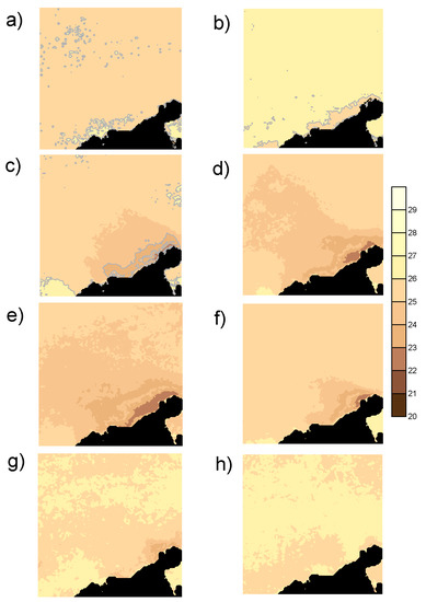 Sequence of sea surface temperature (SST) imagery from (a) November 2007, (b) December 2007, (c) January 2008, (d) February 2008, (e) March 2008, (f) April 2008, (g) May 2008, and (h) June 2008. Units are degrees Celsius. The coordinates are detailed in Figure 1.