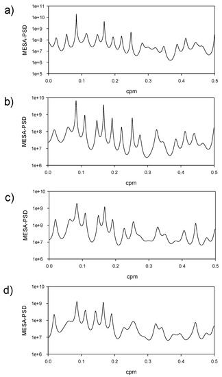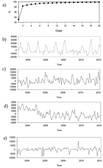 The logarithmic MESA-PSD values of the first four temporal modes are shown in Figure 4a–d, and more relevant periods can be found in Table 1. The first and most important mode (Figure 4a) presents a well-defined temporal pattern (Figure 3b) with a period of one year and six months (Figure 4a). The second mode (Figure 4b) presents the same periods and some others, such as 9, 6.8, 5.2, and 4 months. The third and fourth modes (Figure 4c,4d) have the same periods in their compositions, and a new one of 54 months long is detected. The only clear periods for reading are the annual and semiannual periods; they are used in most of the geophysical signals. The other periods are intentionally left for further works, but some of them were previously noted in [8] and [10].