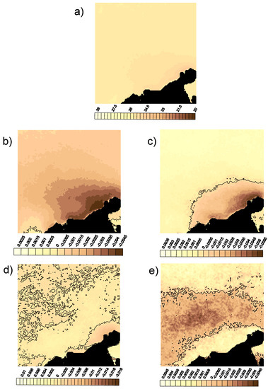 The zero value lines, the nodal lines, are also represented in the spatial modes (Figure 5). The time-invariant lines in a given mode are where each spatial mode pivots, and they can be considered as the statistical limits of the upwelling events in a given area. The most important mode, i.e., the first one in Figure 5b, has no nodal lines, and all fields will oscillate up and down with the corresponding temporal mode. The highest amplitudes cover the area affected by the upwelling. The second mode (Figure 5c) has a nodal line dividing the domain into two halves with different signs, which oscillate up and down depending on the temporal weight. The highest amplitudes correspond to the areas with the coldest waters, and the nodal line can be considered the limit of the most important part of the upwelling. The third mode (Figure 5d) presents some noise, and the fourth mode (Figure 5e) has a banded structure with three areas that are well-delimited by two nodal lines.