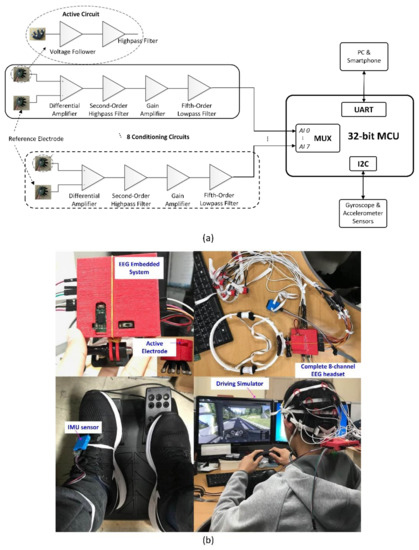 Electroencephalogram (EEG) headset: (a) schematic of the 8-channel EEG circuit with dry active electrodes, (b) photographs of complete 8-channel EEG headset with 3-D printed flexible cap and the experimental setup for the virtual driving environment.