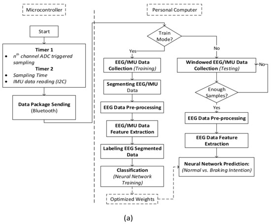 Figure 2a shows the flowchart of the whole system. It consists of training mode and testing mode. In the training mode, 20-min 8-channel EEG and IMU data are captured during the simulated driving task. In contrast to [22], the training data are collected by sliding the window along the data length, in the same manner as online testing. The analyzed window is set as 1 s, and the step size is varied to investigate its effects on the system performance. The IMU data are segmented similarly to the EEG data. To pre-process the data, the segmented 8-channel EEG data are band-pass filtered from 1 to 60 Hz that covers EEG wave bands of interest (delta, theta, alpha, beta, and gamma) as well as to remove power line noise (i.e., 60 Hz). Independent component analysis (ICA) is performed to separate other unexpected noises. In particular, one second of the 8-channel EEG data can be expressed as: