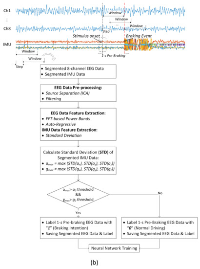 (a) Flowchart of the EEG-based braking-intention detection system, (b) flowchart of the labeling process for EEG data using the inertial measurement unit (IMU) sensor.