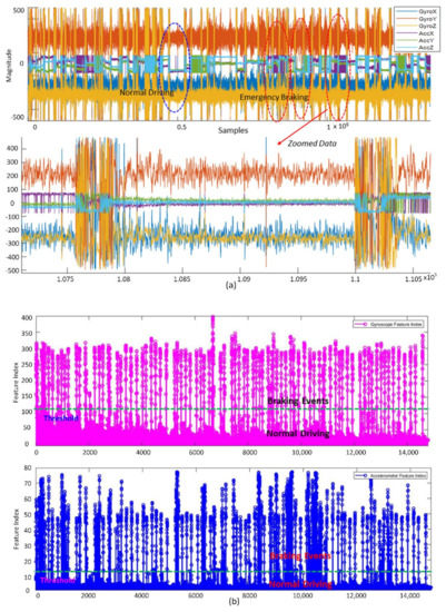 In machine learning, labeling the data prior to the training process plays an important and essential role which partially decides the system performance. Compared with [30], a new method for accurately and reliably labeling the training data based on motion-sensing was introduced in this work. Generally, compared with previous studies [18,22], several aspects have been considered to make the proposed system more robust and reliable. For instance, the offline training procedure that was identical (i.e., windowing analysis, labeling process) to the online testing was conducted. Moreover, the training dataset was sufficiently large for the training process. Detailed analyses of several aspects, such as the effect of the step size in a real-time detection system and the most likely physiological response after the onset of an emergency braking situation were performed.