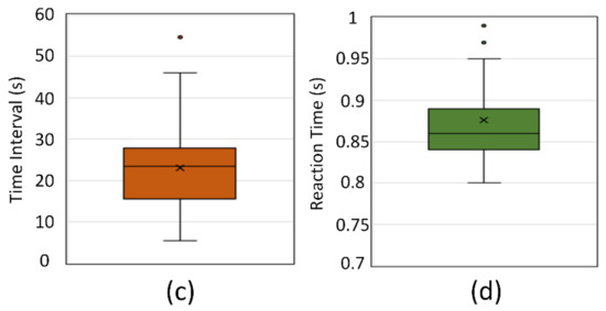IMU sensor data obtained over approximately 10 min of driving during the reaction test are shown in Figure 3a. Obviously, emergency braking events are clearly indicated by abrupt changes in the amplitude of the signals (both accelerometer and gyroscope sensors). There were no significant amplitude changes during normal driving (Figure 3a, bottom). The IMU features were automatically obtained by sliding the 1-s data window along the sensor data. As shown in Figure 3b, if the standard deviation of the segmented data exceeded the predefined threshold, the sample was labeled as “braking intention.” Meanwhile, if the standard deviation was lower than the threshold, the sample was labeled as “normal driving.” The standard-deviation thresholds for the gyroscope and accelerometer sensors were set as 120 and 12, respectively. Figure 3c shows the distribution of the time interval between two consecutive braking events generated by the simulator software. The average value was calculated to be approximately 23 s. This is reasonable because the interval is long enough for the subject to calm down after the emergency situation. The average reaction time of the drivers to the emergency situation was calculated to be 0.88 s (Figure 3d). The driving simulator calculated this value by measuring the time interval between the emergency-stimulus onset and the onset of the executed braking event.