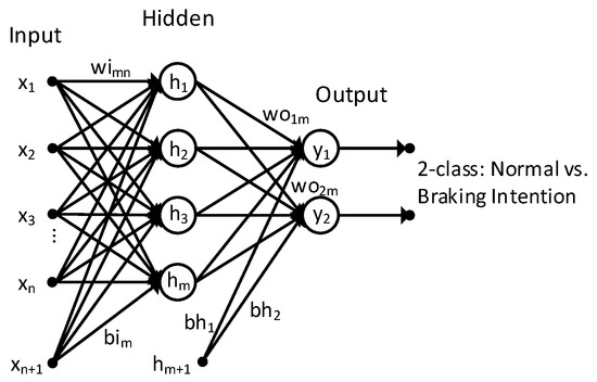 In this study, a multilayer perceptron neural network is used as the classifier. We select neural network as the classifier because it can approximate any nonlinear function and can thus replace popular machine-learning approaches such as linear discriminant analysis (LDA) and support vector machines (SVM). Figure 4 shows the structure of the network that is used. The proposed neural network comprises three layers: input, hidden, and output. The size of the input layer of the network is equal to the size of the input features. For the PSD-based feature extractor, the feature covers five EEG bands (delta, alpha, theta, beta, and gamma), resulting in 40 inputs (5 bands × 8 channels). For the AR model feature extractor, the size of the feature is equal to the AR model order number multiplied by the number of EEG channels (eight). As mentioned previously, different AR model order numbers are investigated to obtain the best classification performance. Thus, the size of the input layer of the network is equal to 32, 40, 48, 56, 64, 72, 80, 88, 96, 104, 112, 120, 128, 136, 144, 152, 160, and 168 corresponding to AR model order number of 3, 4, 5, 6, 7, 8, 9, 10, 11, 12, 13, 14, 15, 16, 17, 18, 19, and 20, respectively. One disadvantage of the multilayer perceptron is that it requires tuning the number of hidden neurons. Therefore, in this study, we also investigate the system performance with respect to the number of hidden neurons (10, 20, 50, 100, 500, and 1000) to obtain the best network configuration. The output layer comprises two neurons corresponding to two classes: normal driving and braking intention. Sigmoid is chosen as the activation function of the hidden neurons, and softmax is chosen as the activation function of the output neurons. The general form of the softmax function is: